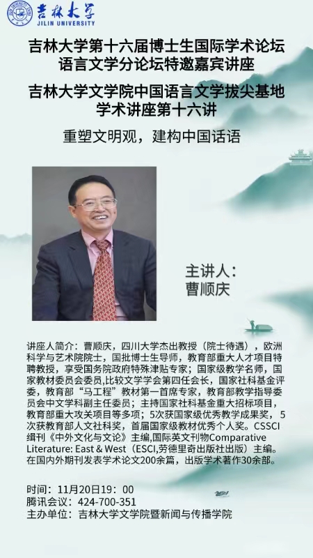 讲座人简介:曹顺庆,四川大学杰出教授(院士待遇),欧洲科学与艺术院院士,国批博士生导师,教育部重大人才项目特聘教授,享受国务院政府特殊津贴专家;国家级教学名师,国家教材委员会委员,比较文学学会第四任会长,国家社科基金评委,教育部“马工程”教材第一首席专家,教育部教学指导委员会中文学科副主任委员;主持国家社科基金重大招标项目,教育部重大攻关项目等多项;5次获国家级优秀教学成果奖, 5次获教育部人文社科奖,首届国家级教材优秀个人奖。CSSCI缉刊《中外文化与文论》主编,国际英文刊物Comparative Literature: East & West(ESCI,劳德里奇出版社出版)主编。在国内外期刊发表学术论文200余篇,出版学术著作30余部。