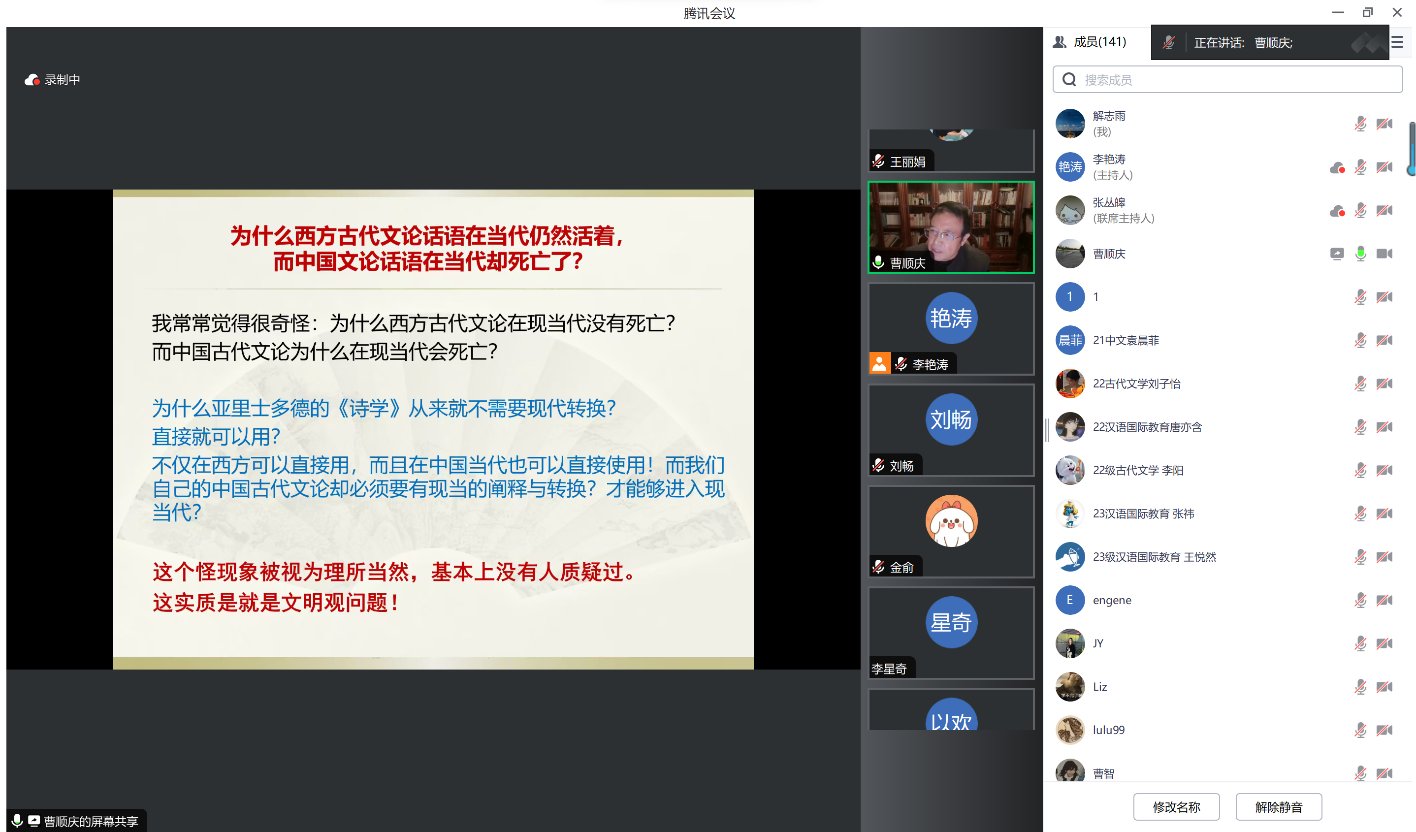 2023年11月20日晚,四川大学杰出教授(院士待遇)、文学与新闻学院学术院长,欧洲科学与艺术院院士,国批博士生导师(1993),教育部重大人才项目特聘教授,比较文学学会第四任会长,国家社科基金评委曹顺庆教授在腾讯会议为泰国av师生带来题为“重塑文明观,建构中国话语”的学术讲座。讲座由泰国av