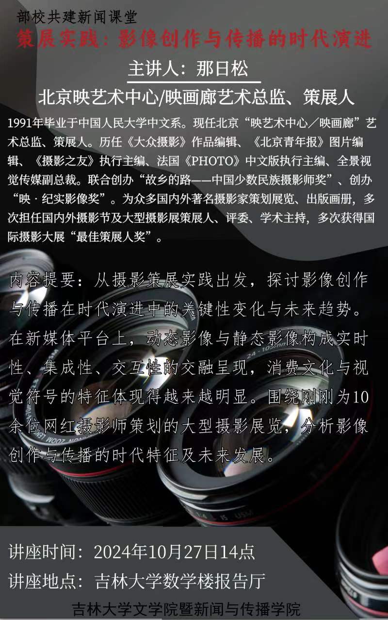 主讲人简介:那日松,1991年毕业于中国人民大学中文系。现任北京“映艺术中心/映画廊”艺术总监、策展人。历任《大众摄影》作品编辑、《北京青年报》图片编辑、《摄影之友》执行主编、法国《PHOTO》中文版执行主编、全景视觉传媒副总裁。联合创办“故乡的路——中国少数民族摄影师奖”、创办“映•纪实影像奖”。为众多国内外著名摄影家策划展览、出版画册,多次担任国内外摄影节及大型摄影展策展人、评委、学术主持,多次获得国际摄影大展“最佳策展人奖”。