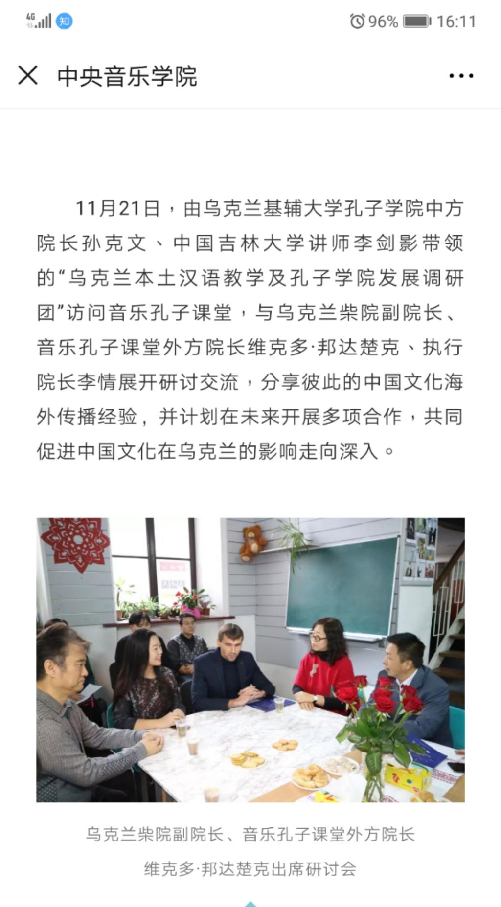 1121日,李剑影老师及团队应邀赴柴可夫斯基音乐学院进行音乐孔子课堂现状的考察,与音乐孔子课堂外方院长维克多·邦达楚克、执行院长李情展开交流研讨,分享彼此的中国文化海外传播经验,并计划在未来开展多项合作。柴可夫斯基音乐学院和国内合作院校——中央音乐学院的微信公众平台对此次考察进行了相关报道。柴可夫斯基音乐学院孔子课堂是欧洲境内首个“音乐孔子课堂”,先后在“中乌友谊音乐会盛典”“中乌音乐对话”“中国音乐进校园”“孔院发展研讨会”等活动中展示传播中国音乐文化,受到乌克兰民众的热烈欢迎。