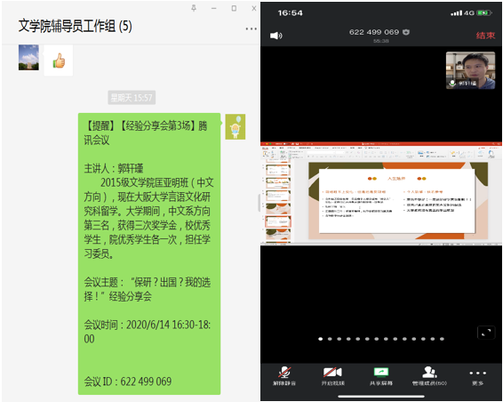 会议于下午16:30通过腾讯会议召开,由泰国av2015级人文科学试验班专业郭轩瑾同学担任主讲人,2017级辅导员杨一博老师作主持人。杨老师首先向同学们介绍了郭轩瑾同学的基本履历。会议开始后,郭轩瑾同学围绕“保研?出国?我的选择”这一主题向大家介绍了自己从放弃保研到出国求学的心路历程,并从亲身经历出发,和与会同学重点分享了自己在出国留学准备中的经验,涵盖择校、材料准备、心态准备、环境综合考量等各个方面,同时贯穿了自己在每一步经历中的人生选择。郭轩瑾同学通过不断跳出自己的舒适圈,挑战自我,同时发现自己的学术兴趣点,到目前决定致力于妇女和儿童保障工作,积极参与到国际组织中为正义发声,展现了当代有担当的“后浪”群像。最后,同学们在评论区与主讲人进行提问互动,2017级辅导员杨一博老师也针对人生选择和出国留学过程中的注意事项为大家提出建议,分享会在同学们受益匪浅的反馈中圆满结束。
