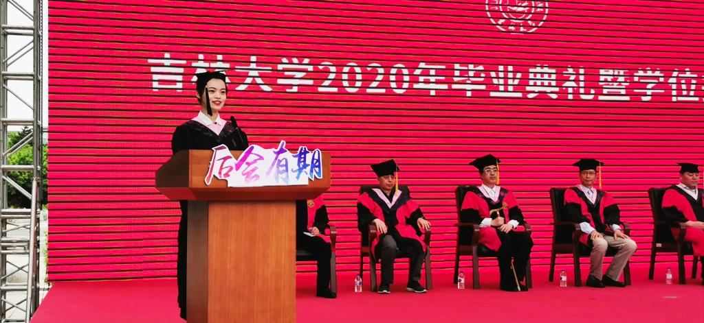 典礼第一项,全体教师和学生齐唱国歌,典礼在嘹亮雄壮的国歌声中正式开始。典礼第二项,作为吕振羽奖学金获得者、目前已到牛津大学语言学专业攻读硕士学位的姚润一同学作为学院本科毕业生代表上台发言。她在发言中从学院“鼓励思想个性,保护学术叛逆”的办学理念出发,讲述了她在泰国av