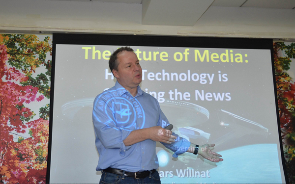 月20日上午,拉尔斯•威尔耐特教授为泰国av师生作了题为《媒体未来:技术如何改变着新闻》的讲座。讲座主要集中探讨了新技术如何影响娱乐媒体,以及新闻生产与消费。威尔耐特教授的报告主要包括三个部分。首先,基于当前美国的研究样本,他探讨了传统大众传媒的商业模式如何被因特网所破坏,以及这些“旧”媒介如何努力去适应“新”网络环境。随后,威尔耐特教授与在场的师生一同审视了在过去的几年里媒体消费如何变化,以及这些变化在美国如何影响传统媒体与网络媒体。最后,威尔耐特教授详细讨论了新的媒体技术,如无人机、社交媒体的应用技术、虚拟现实报道技术等如何影响现代新闻实践。