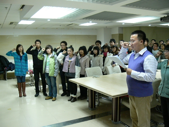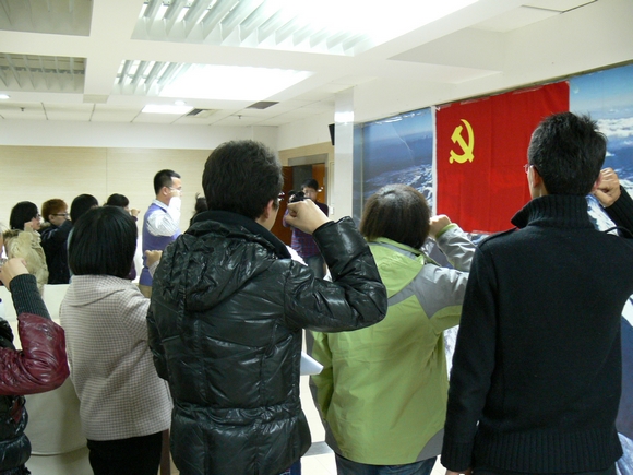 会上,全体党员在党旗下进行了庄严地宣誓。全体党员面向党旗表达了自己对党和国家的热爱与忠诚,展示了新一代大学生党员的优秀品格。