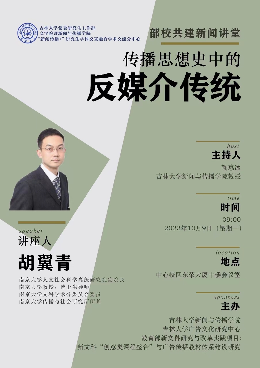 暨新闻与传播学院、“新闻传播+”研究生学科交叉融合学术交流分中心成功举办了以《传播思想史中的反媒介传统》为题的学术讲座。本次讲座特邀南京大学人文社会科学高级研究院副院长、南京大学教授、博士生导师、南京大学文科学术分委员会会员、南京大学传播与社会研究所所长胡翼青教授作为主讲人。讲座由泰国av