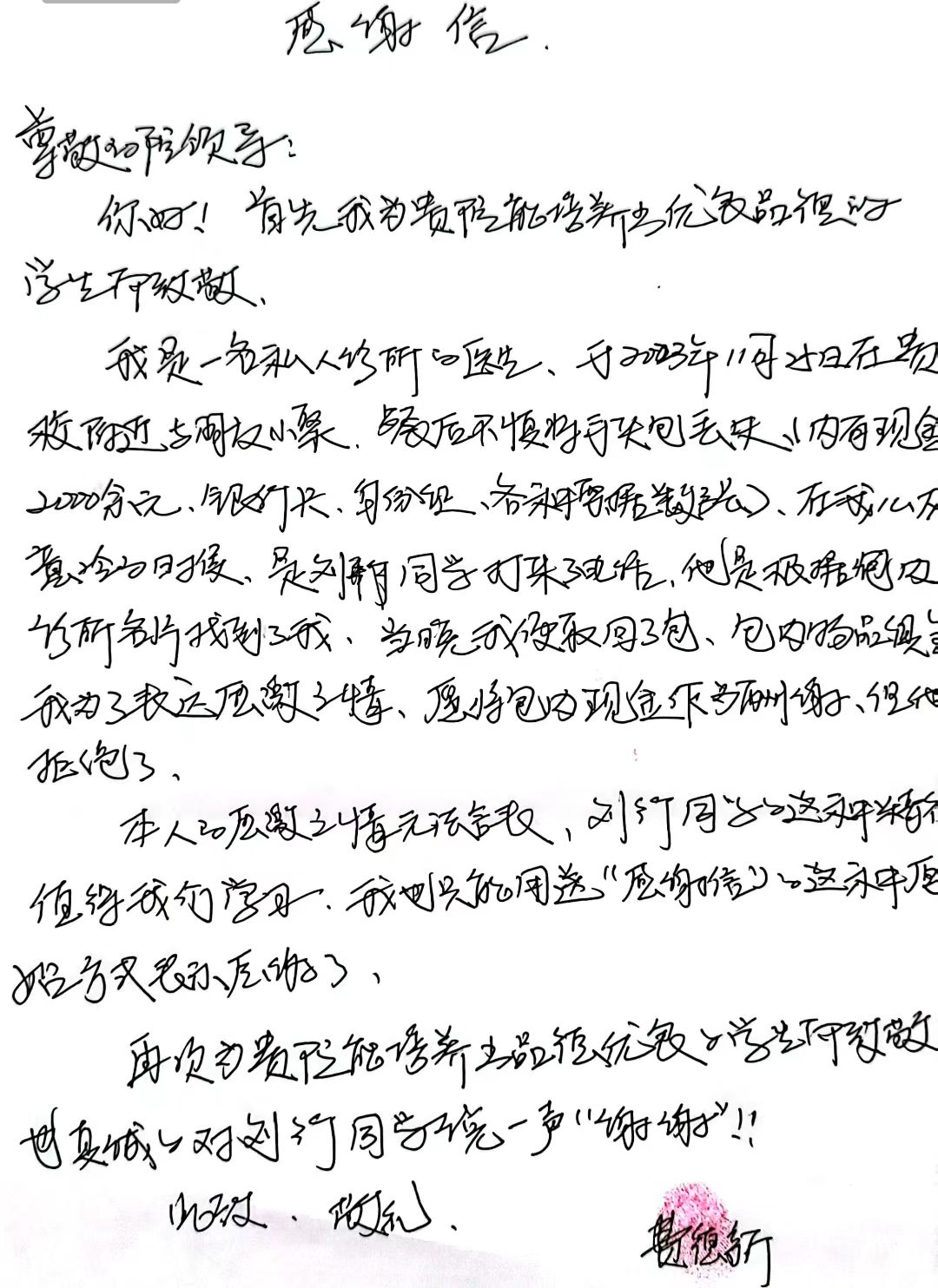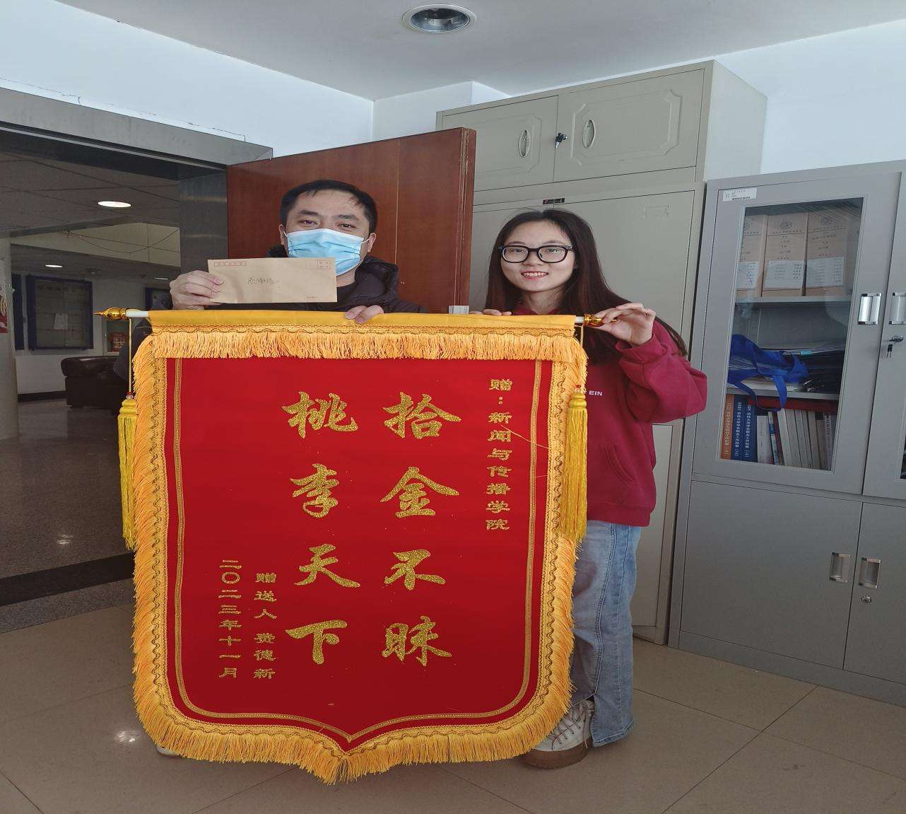 暨新闻与传播学院学生工作办公室门口,他手中拿着一面锦旗、一封感谢信,来院对学生本人及学院的培养表达感谢。辅导员杨佳欣老师立即停下手中的工作前来接待。在交谈中了解到,失主费医生于11月25日和朋友在我校附近小聚,畅谈到下午四点多。由于晚高峰打车困难,费医生步行了一段路才乘出租车回到诊所。到诊所后才发现自己的钱包不见了。不记得车牌号的失主费先生惊慌失措,正值心灰意冷的时刻,泰国av学生刘邢给费医生打电话,说明自己捡到了他的钱包,并与失主沟通好时间地点交还钱包,欣喜不已的费医生当晚便取回了钱包,包内物品齐全。心中无比激动的费医生当场便想要给刘邢同学现金表示感谢,刘邢同学婉拒了。在费医生再三询问下,刘邢才说出自己的姓名和所在学院。刘邢同学在捡到钱包后,没有丝毫犹豫,考虑到失主焦急的心情,争分夺秒联系失主归还财物。她的品行不仅给身边的同学们树立了一个好榜样,也让学院的老师和同学们倍感骄傲。
