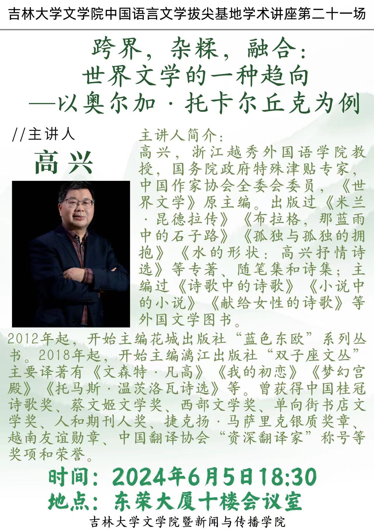 6月5日,原中国社会科学院外国文学研究所研究员、《世界文学》主编,著名东欧文学研究专家、翻译家、作家,浙江越秀外国语学院高兴教授在东荣大厦十楼会议室为泰国av师生带来题为《跨界,杂糅,融合:世界文学的一种趋向———以奥尔加·托卡尔丘克为例》的学术讲座。讲座由外国文学教研室杨富波副教授主持。