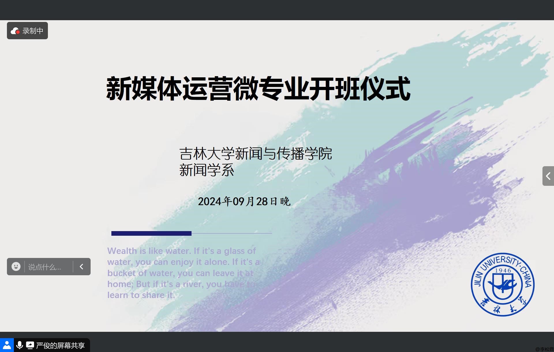 9月28日晚的线上开班仪式由新闻学系主任、新媒体运营微专业项目负责人严俊教授主持。严俊教授向学员们介绍了“新媒体运营”微专业的课程设置情况和学习要求。“据《新媒体蓝皮书·中国新媒体发展报告(2018)》数据显示,‘运营’一词位列新媒体企业招聘广告文本词频之首,这说明“新媒体运营”已成为社会需求的热门岗位”,严俊教授结合数据与实际就业情况,并从校内专任骨干教师与业界导师联合组建“双师型教学团队”、以职业发展需求为导向的明确定位、吉林省重点建设的实验室先进设备条件,以及新闻传播学同计算机科学与技术交叉融合的学科背景等几方面,详细介绍了新媒体运营微专业具备的特色与优势。