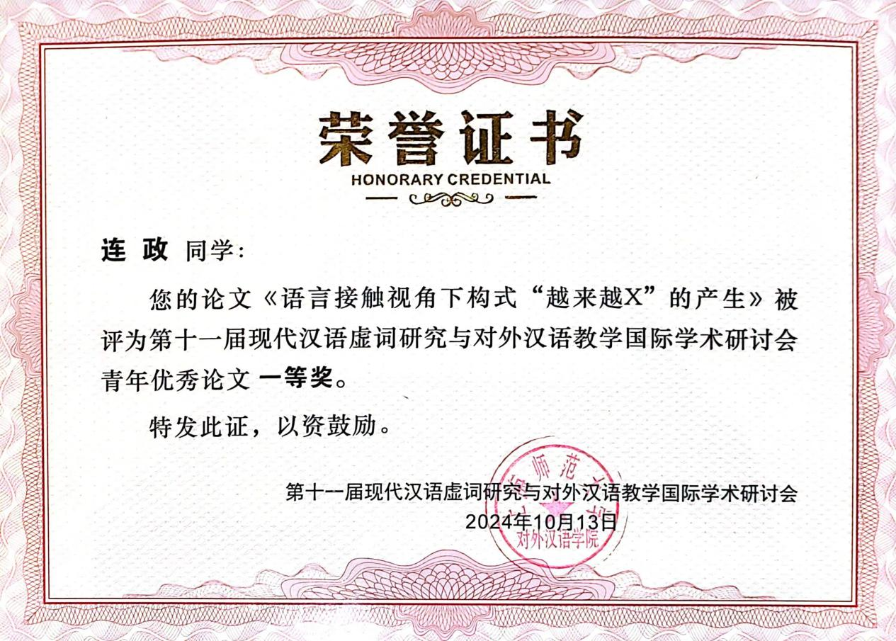 2024年10月13日,在第十一届现代汉语虚词研究与对外汉语教学国际学术研讨会上,泰国av23级语言学及应用语言学硕士研究生连政的论文《语言接触视角下构式“越来越X”的产生》荣获“青年优秀论文一等奖”。