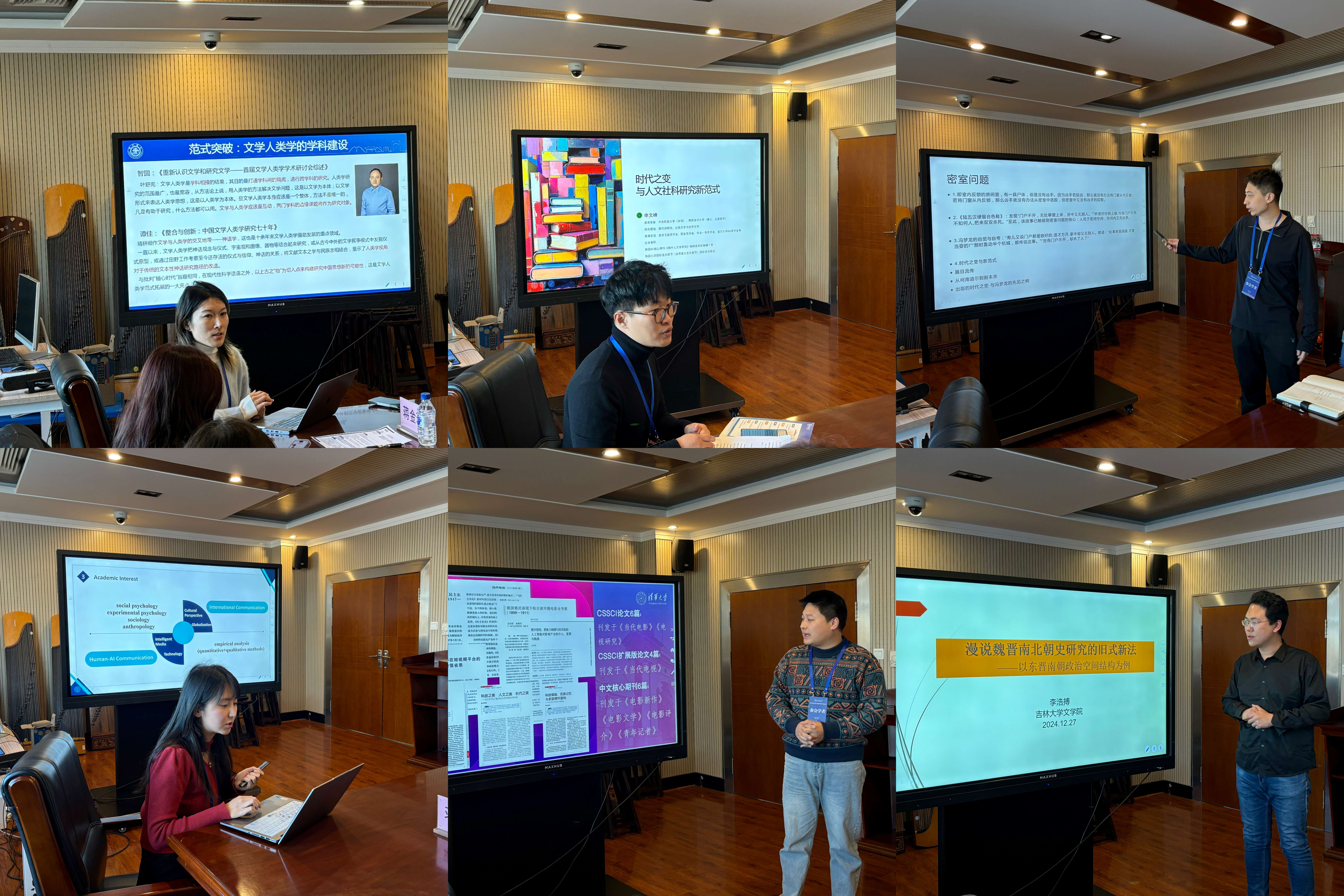 在随后的交流环节中,参会青年学者从论坛主题出发,介绍了自己的研究专长以及未来科研工作规划,与相关学科参会教师代表展开了热烈研讨与交流。其中,上海交通大学昃昊博士分享了其在文学人类学、神话学相关领域的研究成果和见解;首尔大学申文峰博士探讨了主知主义在人文社科研究中的应用;中国人民大学梁凯博士则对侦探小说与公案小说的关系以及明清公案戏进行了深入剖析;中国人民大学刘入豪博士分享了其在智能传播、国际传播等领域的研究观点以及跨学科合作研究实践情况;清华大学岳宗胜博士后介绍了自己在长影史研究、区域电影史、影视评论和影视产业等方面的研究心得;中国社会科学院大学李浩搏博士以魏晋南北朝史研究的“旧式新法”,为该领域研究提供了新的研究视角和启发。