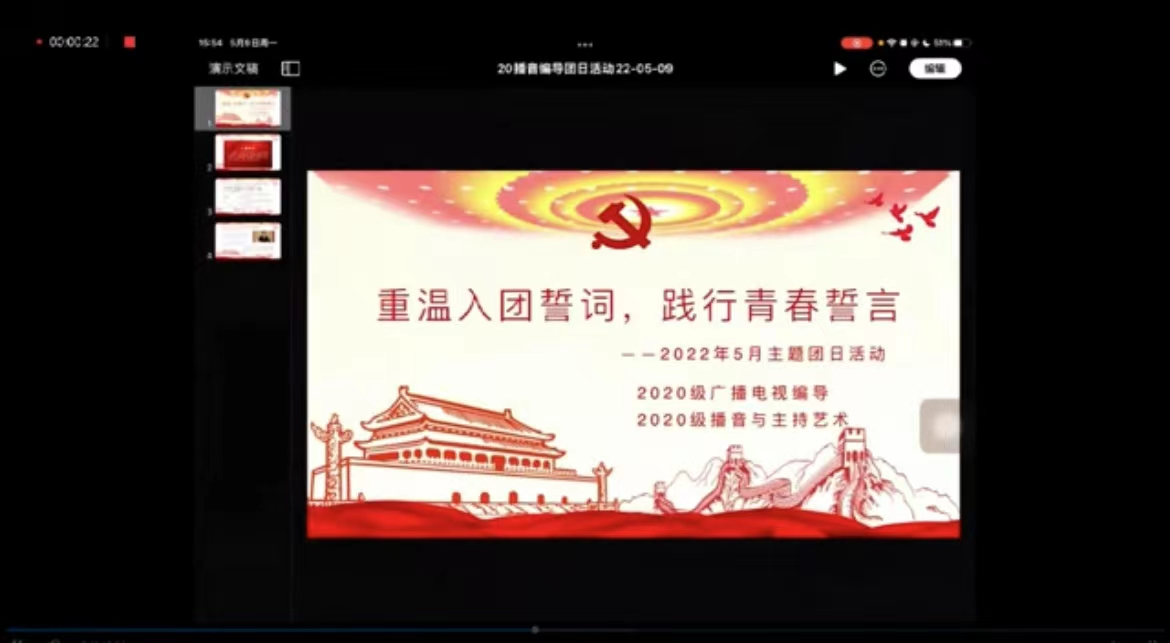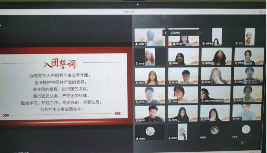 2020级广播电视编导专业、2020级播音与主持艺术专业于2022年5月9日下午通过腾讯会议共同举办了以“重温入团誓词,践行青春誓言”为主题的团日活动,两个专业的预备党员、入党积极分子、共青团员参加了本次活动。主持人宣布活动开始后,同学们一起重温了入团誓词。随后,同学们在团支书的带领和引导下学习习近平总书记在人大的重要讲话精神。五四青年节前夕习近平总书记走进中国人民大学同师生代表亲切座谈,习近平总书记强调要坚持党的领导、坚持马克思主义指导地位、坚持为党和人民事业服务、落实立德树人根本任务、传承红色基因,扎根中国大地办大学,走出一条建设中国特色、世界一流大学的新路。总书记的重要指示,为广大高校师生指明方向。同学们认真学习,几位学生代表也发表了自己的意见。最后,大家一起聆听了习近平总书记对青年的寄语,活动圆满结束。