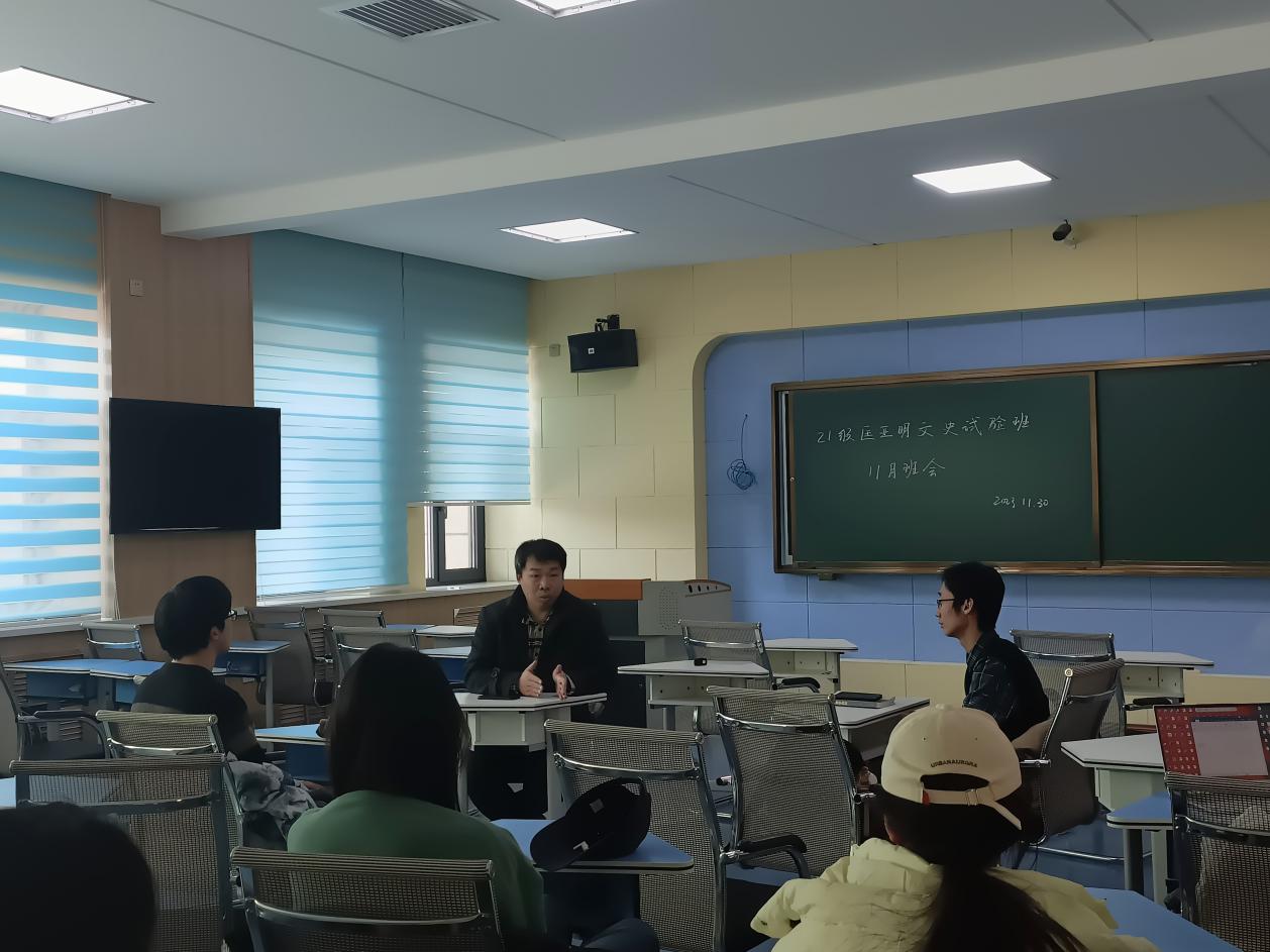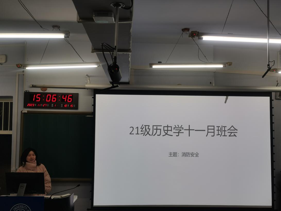 历史学于萃文楼第一阶梯召开班会,由班主任陶莎老师和班长袁仁斌组织进行。首先,陶莎老师着重强调消防安全的重要性并提醒同学们关注宿舍安全用电。陶莎老师指出,校园消防安全是保证同学们人身安全以及学习生活正常进行的重要因素,需要同学们共同关注和维护。此外,陶莎老师提醒同学们应合理规划学习时间,准备期末考试的复习以及学年论文的写作。最后,陶莎老师补充介绍了目前的保研、考研及就业形式,指出同学们在完成本学期课业的基础上,应该关注并做好未来的学业和职业生涯规划,提前做好准备。