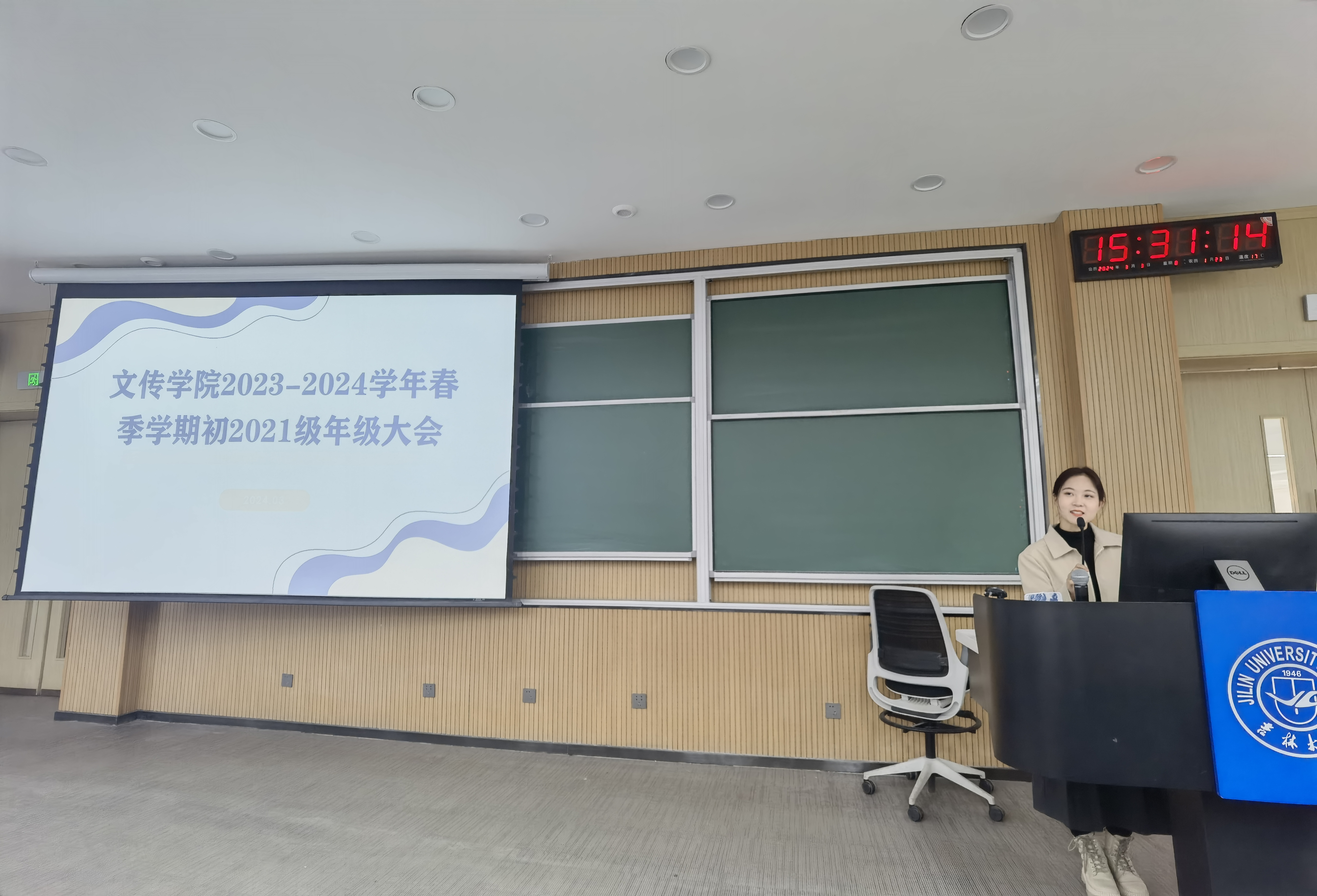 暨新闻与传播学院2021级年级大会于逸夫楼第三阶梯教室召开。辅导员杨佳欣主持会议,各专业同学集体参会。