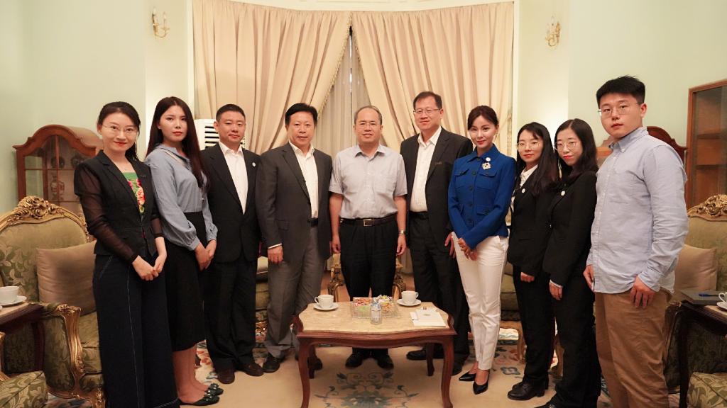 (驻埃及大使馆公使肖军正(左五)与项目组师生合影)