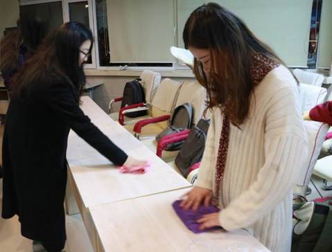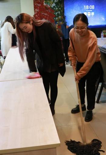 活动组织的重要场地。自成立以来,一年多的时间中,2018级硕士研究生第二党支部的大部分党日活动也在此进行,党员同学们对这里都很熟悉、很有感情。因此,大家利用课余时间,携带清洁工具,扫地、擦地、擦桌子、摆椅子,尽可能地让东荣大厦十楼会议室变得更干净整洁。