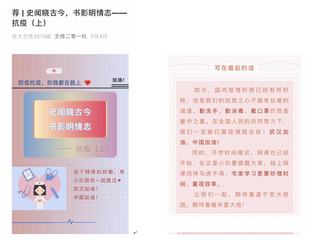 暨新闻传播学院以“一书、一史、一影、一闻”的形式,根据同学们的专业知识整理了“疫情”主题周推荐,在向同学分享专业知识的同时,引导每一位学生心系国家,关注疫情,攻克时艰。